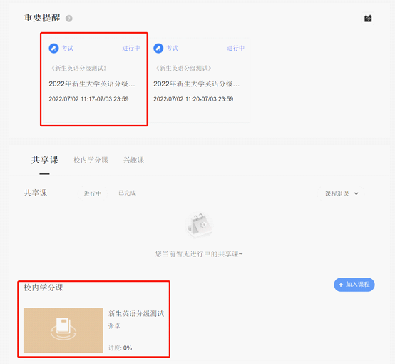 4.在登录状态,点击主页右上角“我的学堂”。若在考试时段,直接点击“重要提醒”中的考试项目,即可进入考试。若在非考试时段,点击“校内学分课”中的“新生英语分级测试”-“学习任务”,查看考试时间。