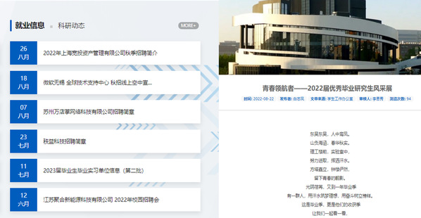 为促进毕业生高质量就业,学院系统谋划、统筹安排,精准排查、分类指导,全面推进2023届研究生的就业指导工作。为准确掌握研究生的就业意向,学院通过发布腾讯问卷、谈心谈话等方式逐一摸排学生想法,建立“一生一档”数据库,实时更新就业动态。在学院微信公众号、学院官网开设“就业信息”专栏,定期推送各大企事业单位招聘信息,同时在学院官网开设“师生风采”专栏,推送“青春领航者”优秀毕业研究生系列报道20余篇,引导广大计算机学子崇尚先进、见贤思齐。