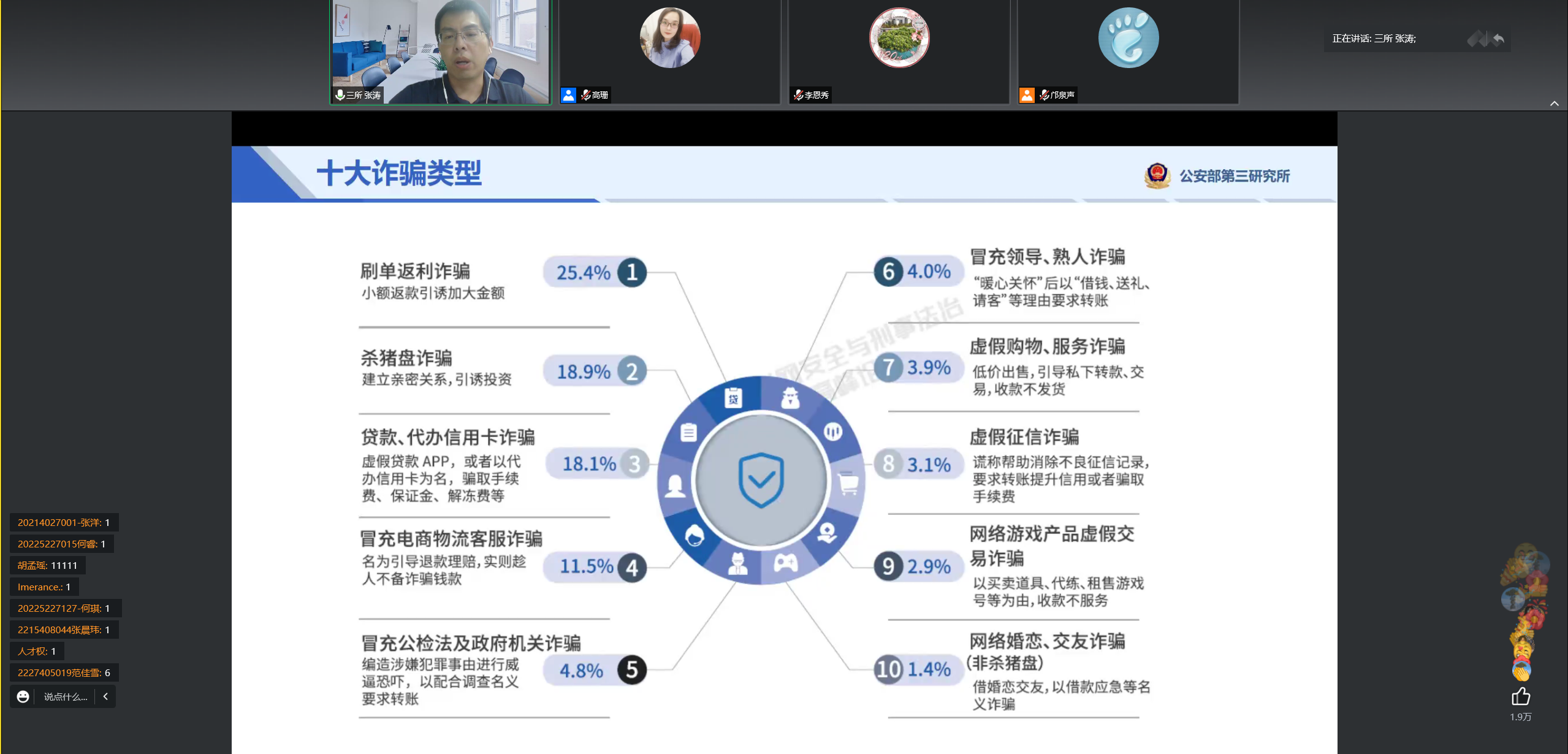 整场讲座气氛热烈,互动频繁,张涛老师在线回答了十余个大家在线提出的问题。同学们学习了常见网络诈骗类型,理解了各种诈骗类型背后的产业链条,有效提高了同学们防范网络诈骗的意识,为营造清朗和谐的网络空间增添了一份安全保障。