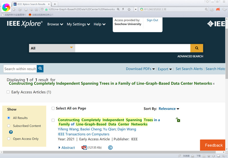 计算机科学与技术学院2017级软件工程1班本科生王懿丰同学近来以第一作者撰写的论文《Constructing Completely Independent Spanning Trees in a Family of Line-Graph-Based Data Center Networks》被计算机体系结构领域的顶级期刊《IEEE Transactions on Computers》(简称IEEE TC,中国计算机学会推荐A类期刊)录用(参见图1)。该生自大学二年级就申请加入我院高性能与分布式计算课题组实验室,积极参与科研项目的理论研究与科学实验工作,并先后取得了数项软件著作权如《SWCube数据中心网络上完全独立生成树演示软件V1.0》(登记号:2019SR1061765)、《线图中完全独立生成树的构造平台V1.0》(登记号:2021SR0284537)等。本次发表的论文是在我院程宝雷老师和美国蒙特克莱尔州立大学的王大进教授共同指导下完成的,该论文是近几年来我院师生首次在《IEEE Transactions on Computers》上发表的期刊论文,为我院师生未来在此期刊论文撰写和投稿方面提供了借鉴意义。论文摘要简要描述如下:
