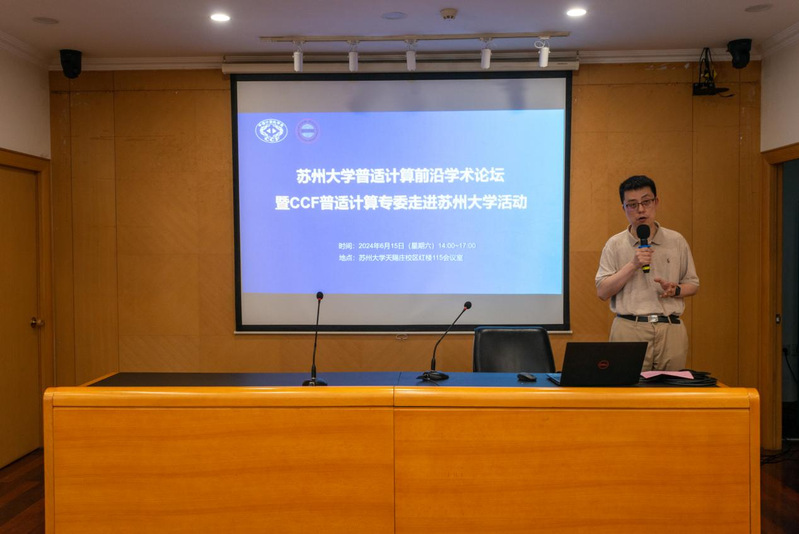 6月15日下午,“苏州大学普适计算前沿学术论坛暨CCF普适计算专委走进苏州大学活动”在天赐庄校区红楼115会议室隆重举行。本次活动由中国计算机学会(CCF)主办,CCF普适计算专委会、我校计算机科学与技术学院、软件学院承办。西北工业大学计算机学院副院长、国家杰出青年科学基金获得者郭斌,北京大学博雅特聘教授、教育部长江学者王亚沙,南京大学计算机科学与技术系副主任、教育部青年长江学者谢磊,湖南大学信息科学与工程学院教授、教育部青年长江学者刘璇出席了活动。会议由我校计算机科学与技术学院教授、院长助理许佳捷主持。