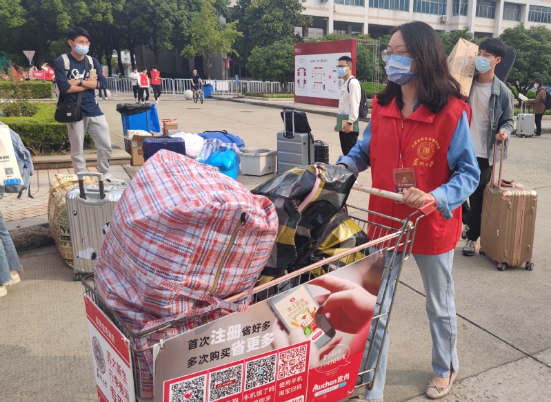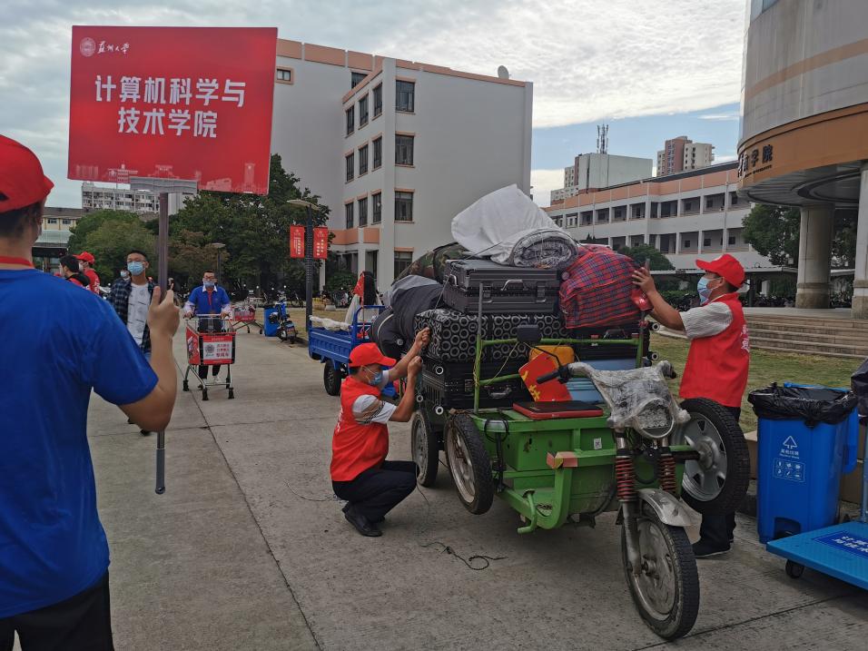 只见新生们在学长学姐的引导下有条不紊地完成了报到、登记、领取学生卡等一系列工作。热情的志愿者们早已将重重的行李箱分门别类地安置妥当,将行李装上送往宿舍楼的电动三轮车,带着满满的希望即刻启程。