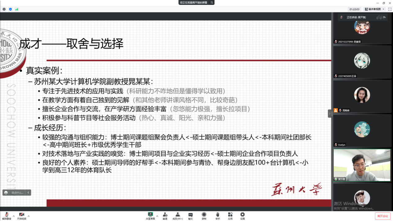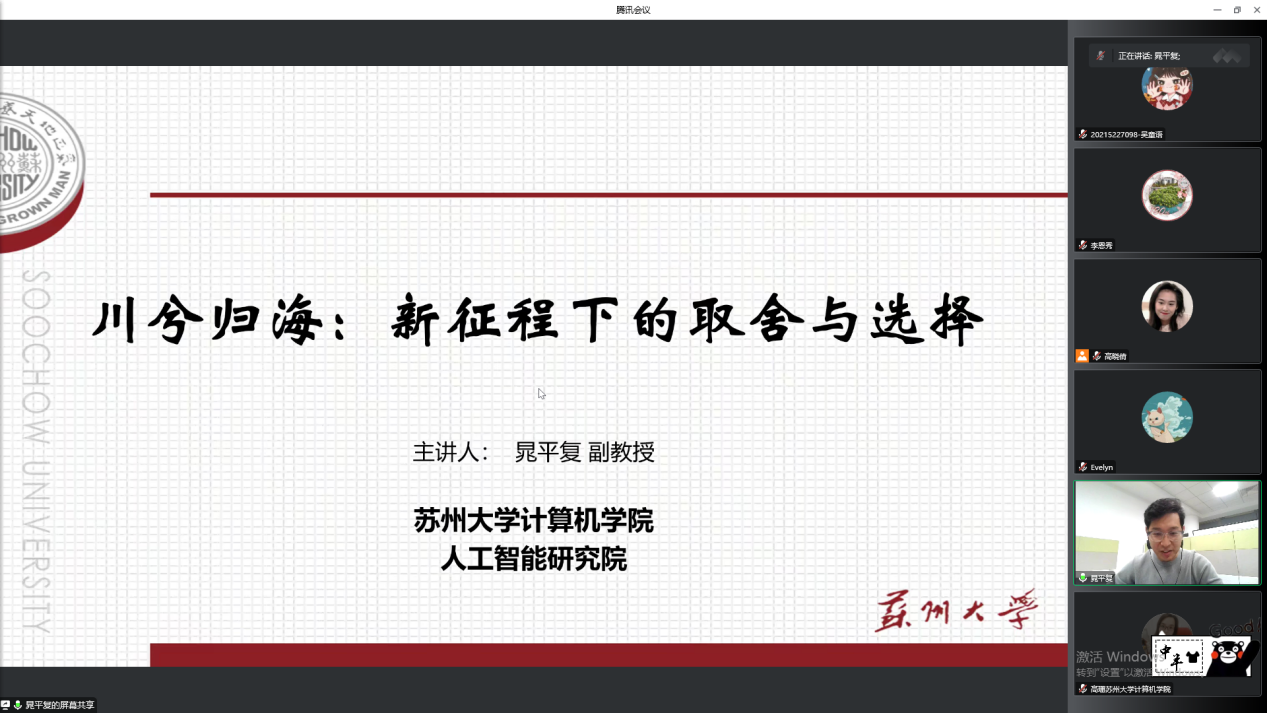11月9日晚,计算机科学与技术学院人工智能研究院晁平复副教授为学院2022级新生开展了一场以“川兮归海:新征程下的取舍与选择”为主题的分享会。考虑到疫情防控安全,本次分享会以线上会议的方式举办,近三百人线上参加了讲座。活动由学院党委副书记、副院长李恩秀主持。