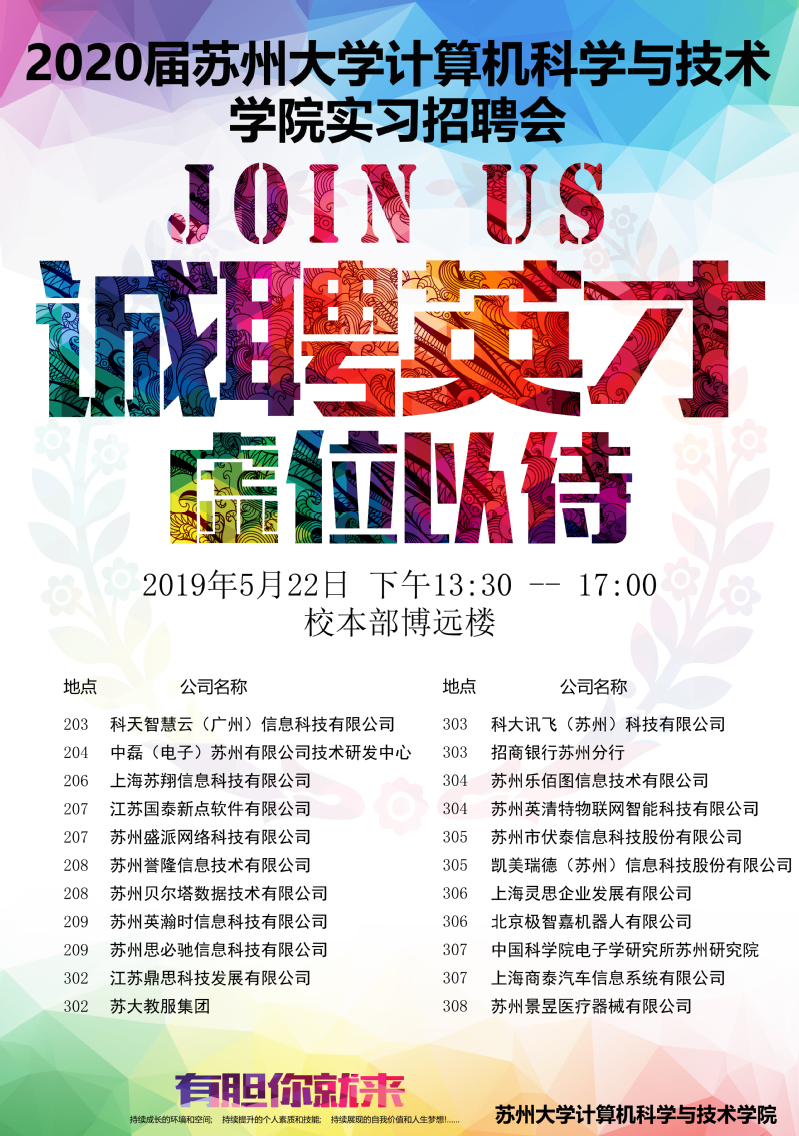 为推进我校2020届毕业生实习工作,促进毕业生熟悉职场环境并提升其就业能力,也为了用人单位挑选到更多的优秀员工满足单位发展的需要,搭建用人单位与毕业生双向交流的平台,我院将于2019年5月22日在本部(天赐庄校区)举办“2020届苏州大学计算机科学与技术学院实习招聘会”。22家用人单位参加,提供400余个岗位。