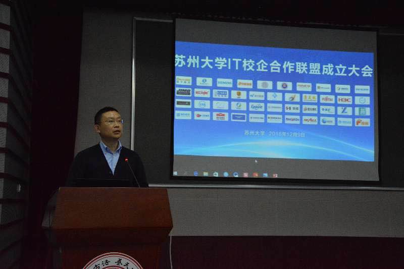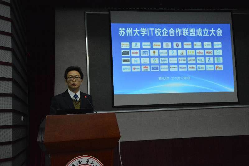朱巧明代表我校科学技术研究部和苏州市计算机学会在会上发言。他首先对IT校企合作联盟的成立表示祝贺和感谢,并介绍了苏州大学IT相关学科的发展和建设情况。通过计算机科学与技术学院发起成立的平台,深化校企合作,是一种非常创新的模式,也必将为平台注入新的活力。苏州计算机学会也会调动各类资源,为校企合作联盟提供全力支持。