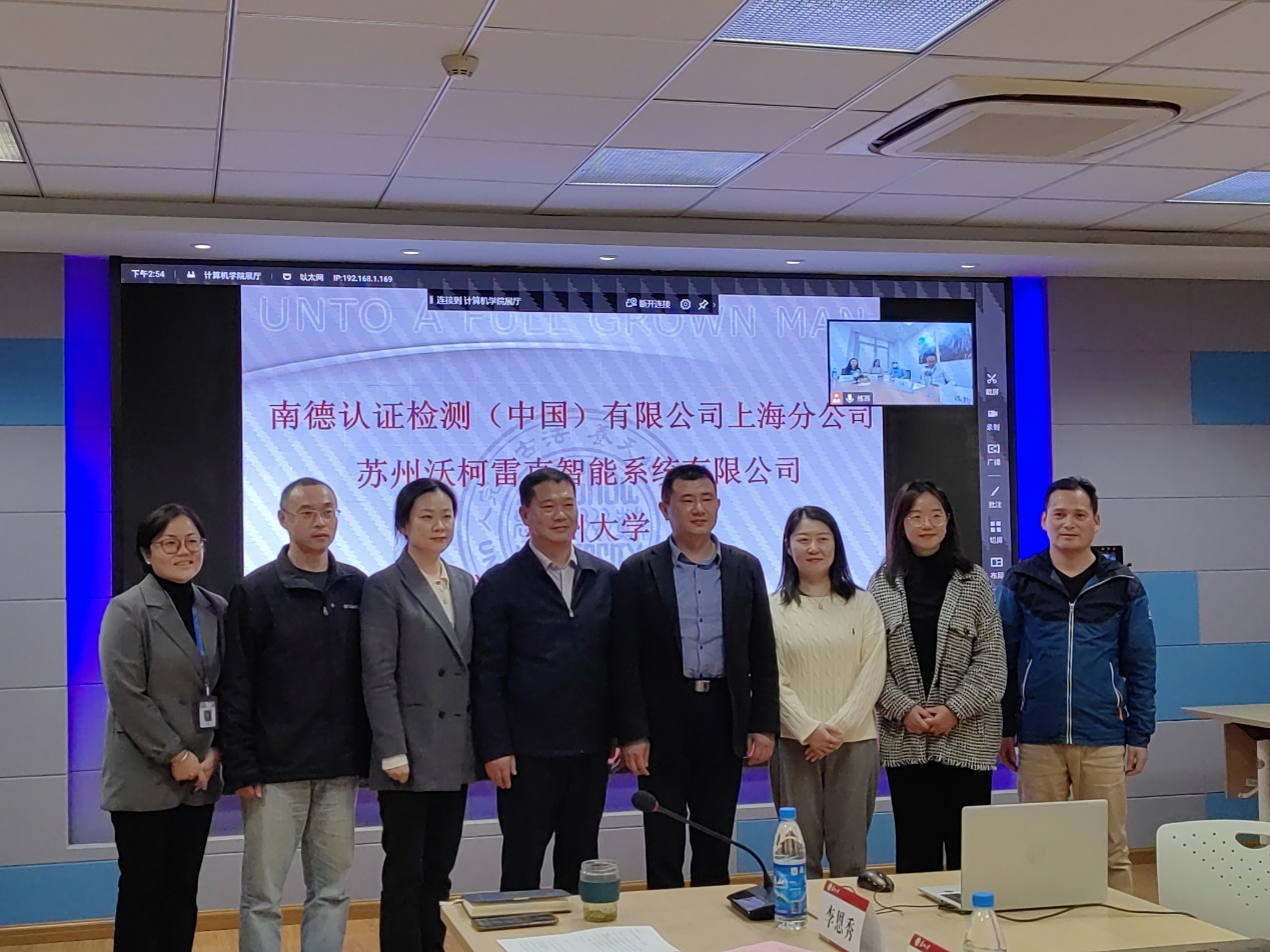 真情点燃希望,爱心筑梦前行。11月16日下午,苏州大学“TUV SUD”创新奖学金、苏州大学沃柯雷克奖学金捐赠仪式在天赐庄校区本部理工楼217举行,TUV SUD北亚区高级副总裁孙建军先生、TUV SUD数据与网络安全服务高级经理方华先生、苏州沃柯雷克智能系统有限公司总经理&创始人张子洋先生、苏州大学国内合作发展处副处长刘子静、计算机科学与技术学院党委书记胡新华、学院副院长赵雷等领导出席了本次捐赠仪式,活动由学院党委副书记、副院长李恩秀主持。
