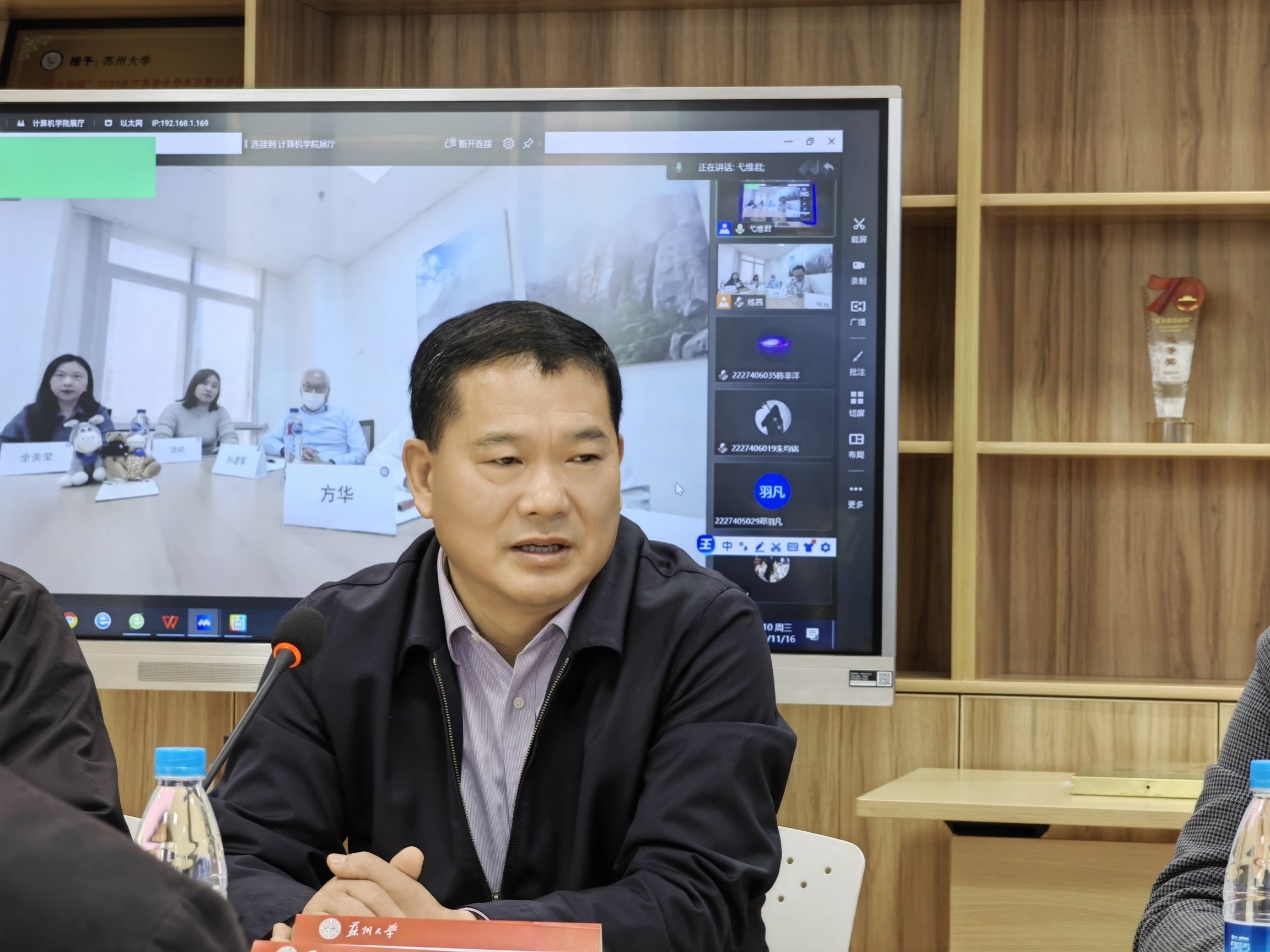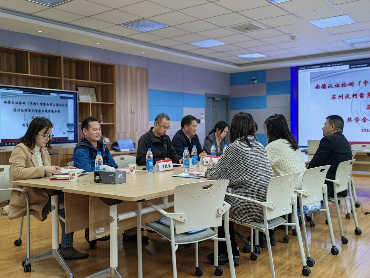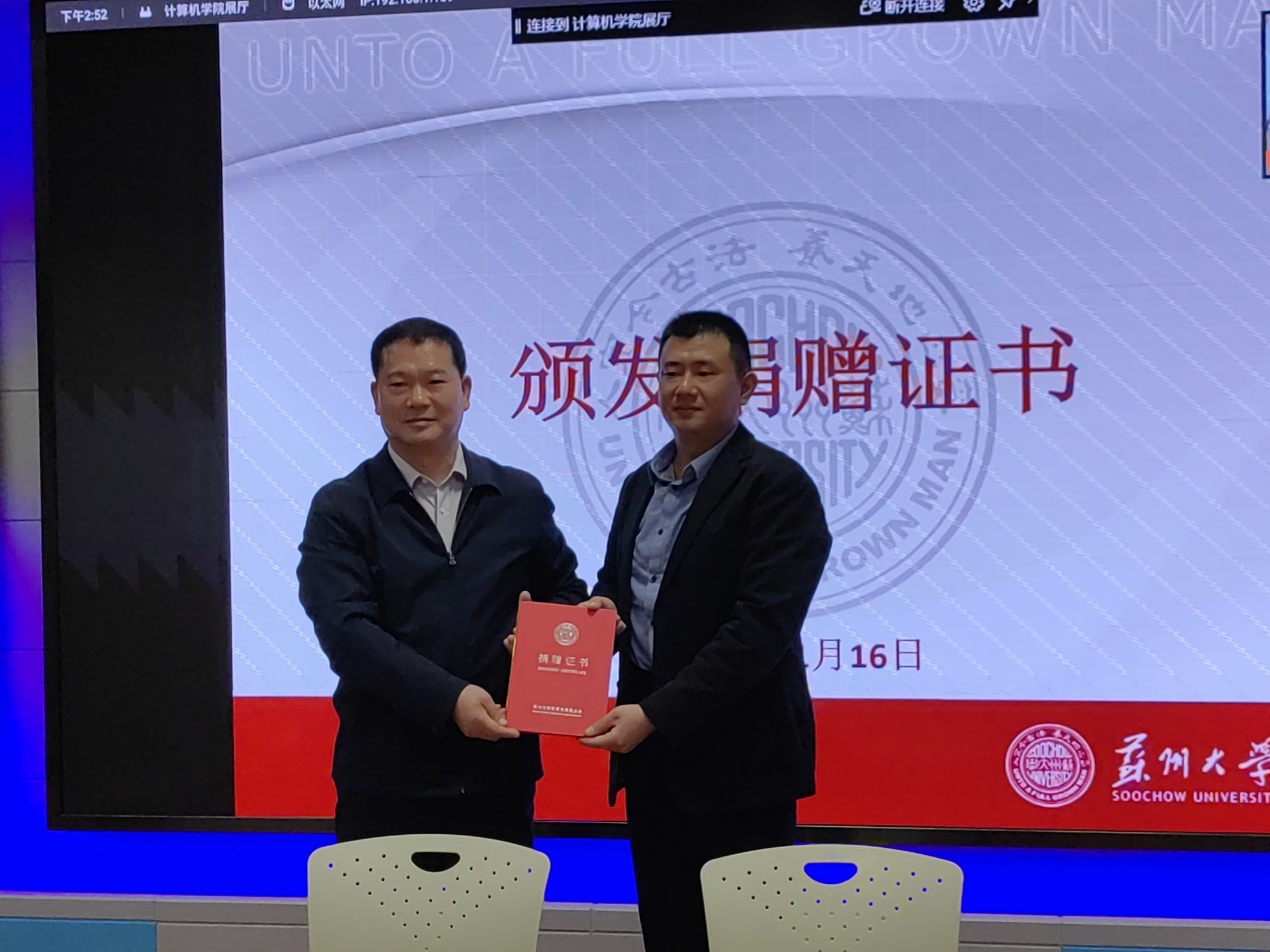 真情点燃希望,爱心筑梦前行。11月16日下午,苏州大学“TUV SUD”创新奖学金、苏州大学沃柯雷克奖学金捐赠仪式在天赐庄校区本部理工楼217举行,TUV SUD北亚区高级副总裁孙建军先生、TUV SUD数据与网络安全服务高级经理方华先生、苏州沃柯雷克智能系统有限公司总经理&创始人张子洋先生、苏州大学国内合作发展处副处长刘子静、计算机科学与技术学院党委书记胡新华、学院副院长赵雷等领导出席了本次捐赠仪式,活动由学院党委副书记、副院长李恩秀主持。