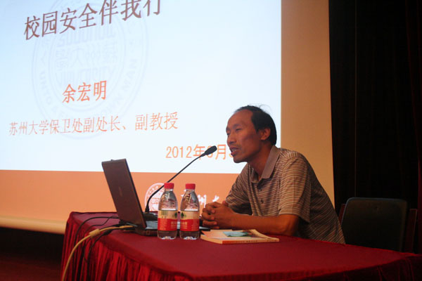 8月30日下午,苏州大学保卫处副处长、副教授余宏明老师在敬贤堂为计算机科学与技术学院2012级新生做了“校园安全伴我行”主题讲座。学院党委副书记沈云彩、2012级辅导员张芸以及全体2012级新生认真聆听了讲座。