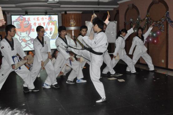 温馨的视频拉开晚会帷幕,视频展示了过去一年研究生们温暖搞怪的照片集锦,视频中还有许多研究生畅谈“我的未来式”的采访,不少场景令现场笑声此起彼伏。由陈文阳等同学表演的舞蹈《程序员style》掀起了晚会的第一个高潮。搞怪的装扮、幽默的剧情和程序员风格的舞姿简直令现场沸腾了。我院模范情侣吴剑和权丽君深情演唱歌曲《你被写在我的歌里》,现场观众仿佛如被灌了蜂蜜一般。侯婕等同学演唱的《那个》让人回忆起曾经的那时那人那事那景。王邦军老师的一曲《山楂花》,醉了很多少女的芳心。多才多艺的范冀成同学带来的竖笛演奏《天空之城》,现场一下子安静下来了,在浮躁时,世故时,或者胡思乱想时,这样的音乐让我们感受到爱,善良,眼前浮现出生命之树。接下来更多精彩的节目将晚会再次推向高潮。现场令人拍案叫绝的当属由体育学院东方跆拳道社团为我们带来的跆拳道表演《东方·武》。辅导员何书萍老师和中国大学生自强之星李麟青带来的《只对你有感觉》,歌声点燃了所有人的激情掀起晚会的最后一个高潮。