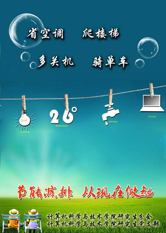 人类靠环境生存,环境靠节能维护。面对全球气候变暖及能源危机的时候,亲爱的朋友们,用自己的微薄之力为我们脆弱的地球做点什么? 地球是人类赖以生存的美好家园,生态环境是人类发展的基础。随着全球经济现代化程度的加深和工业文明的不断推进,环境问题也越来越严重,各种能耗和污染排放日益危及到地球生态平衡和人类生存的根基。珍爱地球,保护地球生态环境成为了我们每一位地球村成员义不容辞的责任。我们有责任,让它的天更蓝,水更清,地更绿。 为了让更多的人树立低碳生活理念,支持和参与节能减排行动,展现全院师生携手保护生态环境的信心和决心。我们向广大师生发出以下倡议: 第一,选择绿色出行方式。尽量多使用公共交通工具、骑自行车或徒步出行,降低油耗和减少废气排放。 第二,合理使用办公设备。短时间不用电脑启用睡眠模式,长时间不用电脑请关机。关闭不用的电脑程序,减少硬盘工作量,调低电脑屏幕亮度,不使用打印机时切断电源。 第三,合理使用文具。减少使用一次性文具,选择纸张双面打印、复印,用电子书代替印刷品,用电子邮件代替纸质信函,使用再生纸。 第四,节约照明用电。注意随手关灯,拉开窗帘,杜绝白昼灯、长明灯。 第五,夏季实验室空调设置不低于26 摄氏度,冬季空调不高于18摄氏度,使用空调时,关好门窗。离开实验室关闭用电设备。 第六,少乘电梯多爬楼,健身又环保。 每节约1度电,就会减少1千克二氧化碳和0.03千克二氧化硫的排放。聚沙成塔,集腋成裘,再小的力量也是一种支持。让我们积极行动起来,以十分的热情投入到节能减排的行动中,用爱心去关注环境变化,用热情去传播节能减排理念。行动起来吧,世界将因你而改变!