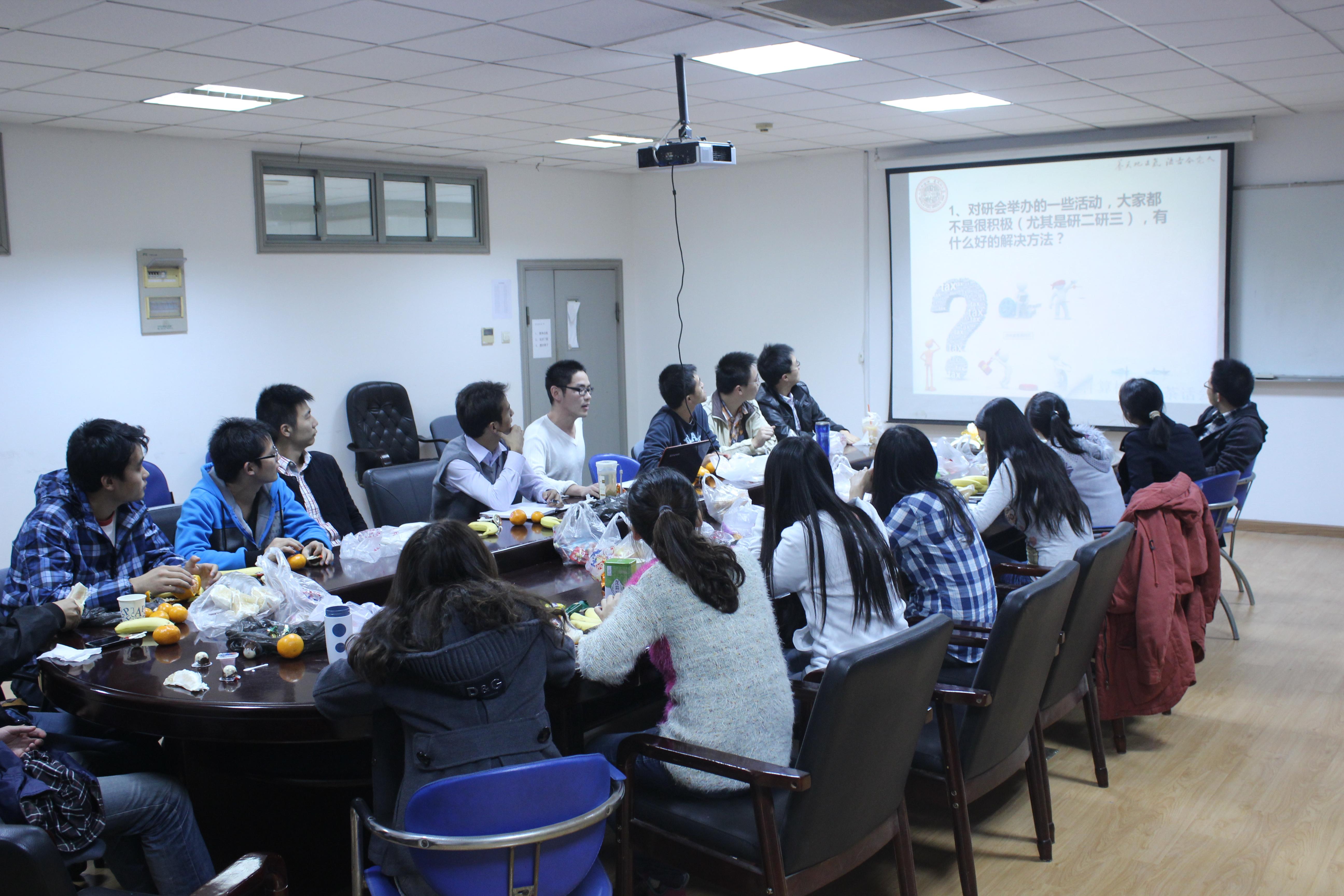 最后我院研会主席总结了本次会议:第一,研会内部成员要加强沟通与交流,并与各班班干紧密联系,将每次活动组织好。第二,我们研会要积极开展活动,对以往活动取其精华去其糟粕,求变求新,为同学们提供更多有趣又有意义的活动,吸引更多人参与进来;第三、加强和兄弟学院的沟通、合作,将我们学院特有的风采展现出来。第四、不与社会脱节,争取赢得社会的赞助,举办的活动达到双赢的局面。最后,建议研会成员以及各班班干积极参加活动,起到先锋带头的作用,积极响应校研会以及院研究生分会的号召。