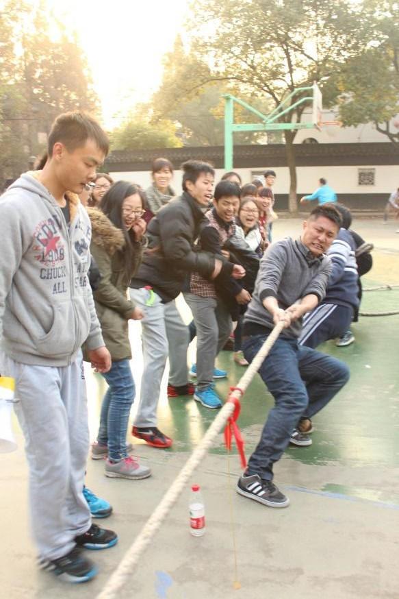 最后举行的是拔河比赛,通过抽签,各支队伍确定了自己的对手。虽然场地偏于光滑,不利于拔河比赛对摩擦力的要求,但参赛队员们的激情不减,啦啦队的呐喊不断。经过淘汰赛激烈的角逐,最终由数学科学学院的拉格朗日队和计算机学院的图灵队进入决赛,进行冠军的争夺。经过简单的休息之后,两队队员卯足了劲,准备最后拼一把。奈何数科院的队伍实力强劲,虽然图灵队使出了浑身解数,但最终仍旧惜败。但他们坚持到最后一刻仍不放弃的精神值得鼓励和学习。