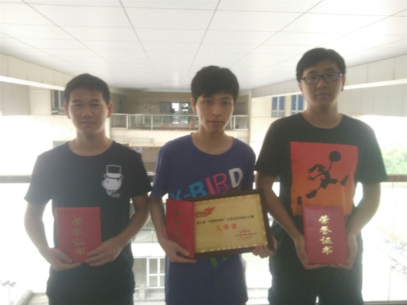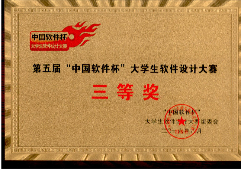 2016年8月22日至27日,第五届“中国软件杯”大学生软件设计大赛决赛在南京航空航天大学明故宫校区举行。我院蒋贤进、徐彩旭和卢奇组成的团队以赛题《针对以经纬度或经纬度带时间定义的不同轨迹》晋级决赛,并获得了第五届“中国软件杯”大学生软件设计大赛决赛三等奖。