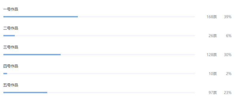 最终,蒋峰同学的一号作品以168票的成绩获得了第一名,张妍同学的三号作品以128票的成绩获得了第二名,朱芬红同学的五号作品以97票的成绩获得了第三名,罗晓慧的二号作品以26票的成绩获得了第四名,潘致远的四号作品以10票的成绩获得了第五名。