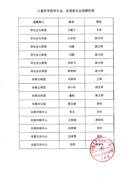 按照2015年计算机科学与技术学院学生干部竞聘方案的要求,现竞聘结果如下:
