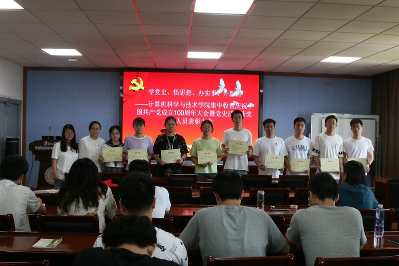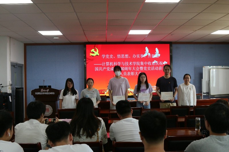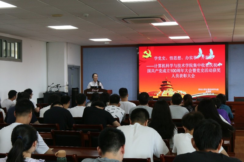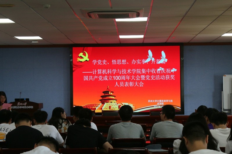 风雨苍黄百年路,高歌奋进新征程。今年是中国共产党成立100周年,在党的百年华诞之际,中共中央决定举行中国共产党成立100周年庆祝活动。为响应党中央的号召,7月1日上午8:00,苏州大学计算机学院组织研究生党员在天赐庄校区理工楼504会议室集中收看庆祝中国共产党成立100周年大会,并以此为契机进行了党史学习教育表彰大会。学院党委书记杨礼富老师、副书记沈云彩老师,研究生辅导员高珊老师、白志凤老师以及各支部研究生党员参加了此次活动。
