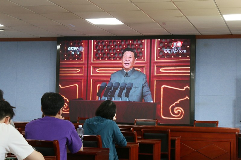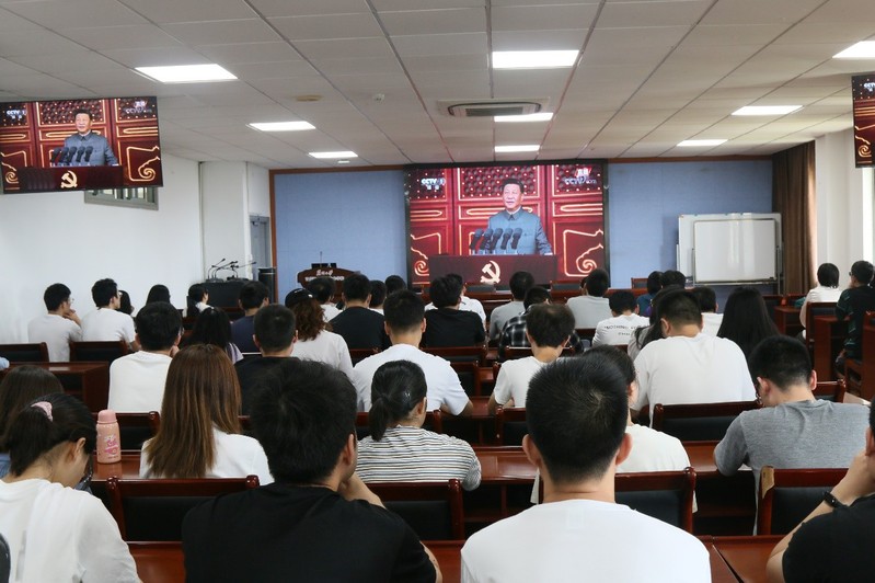 在热烈的掌声中,由中共中央总书记、国家主席、中央军委主席习近平发表重要讲话,党员们全神贯注,认真收听习近平总书记对建党百年历史的总结以及对未来的展望。