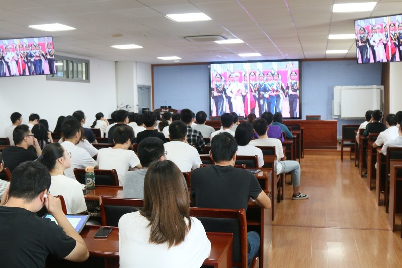清晨,第一缕阳光洒进了504会议室,投射出老师与研究生党员们的身影,他们已早早落座专注收看着庆祝中国共产党成立100周年大会直播。