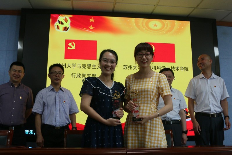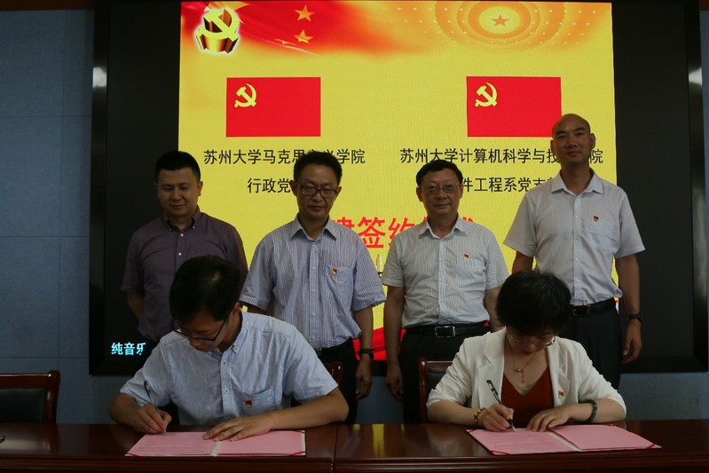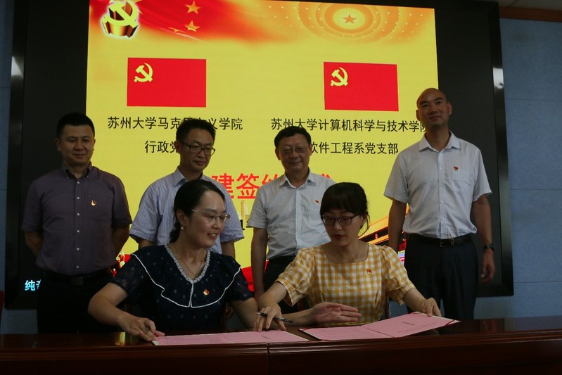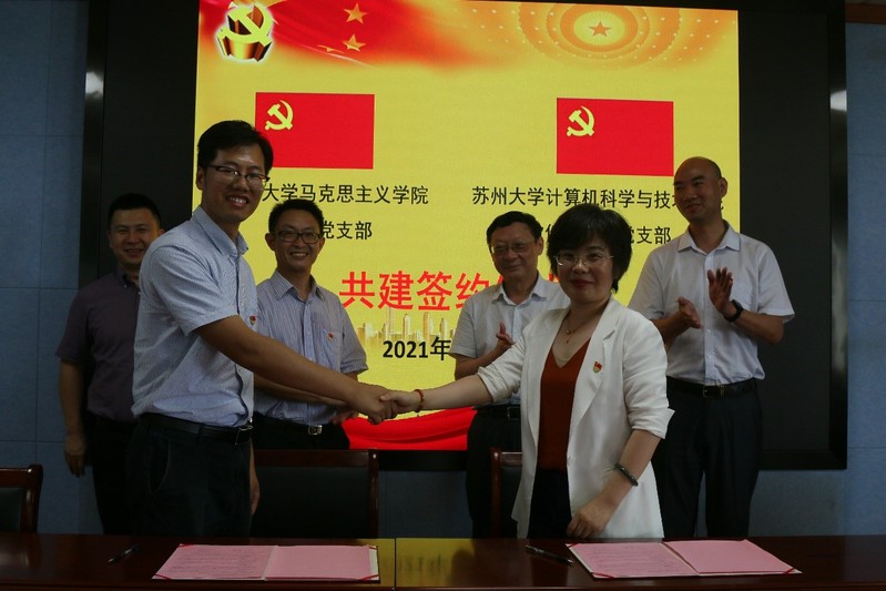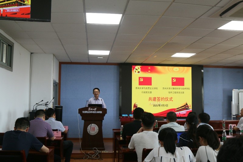 2021年7月7日下午13:30, 为深入学习贯彻习近平总书记“七一”重要讲话精神,发挥基层党支部战斗堡垒作用,推动广大教工党员深入基层、深入师生,共同做好大学生思想政治工作,服务学生成长成才。苏州大学计算机科学与技术学院与马克思主义学院师生在苏州大学天赐庄校区理工楼504会议室,联合开展党支部共建签约仪式暨“学习贯彻习近平总书记‘七一’重要讲话精神”主题党日活动。出席本次活动的有计算机学院党委书记杨礼富,马克思主义学院党委书记陈建军,马克思主义学院副院长茆汉成,计算机学院党委委员、组织员王栋,计算机学院党委委员、软件工程系党支部书记王进,计算机学院研究生辅导员高珊,计算机学院软件工程党支部全体党员,马克思主义学院行政党支部全体党员和双方研究生党员。