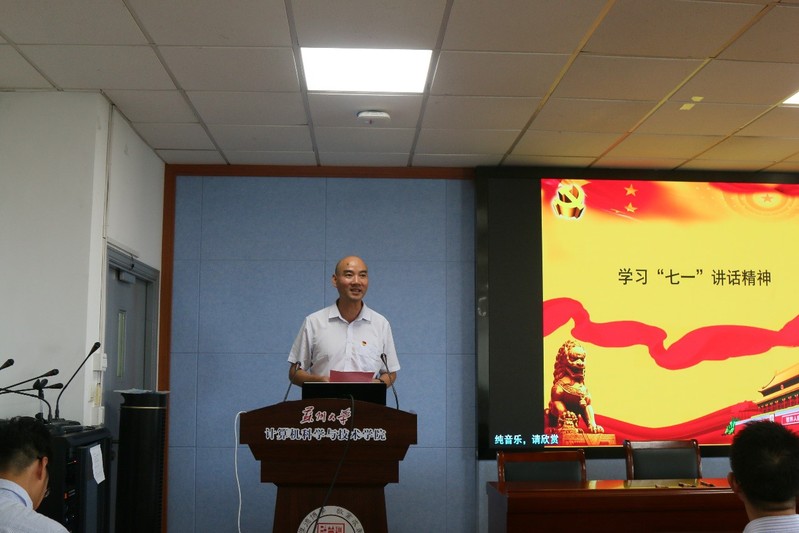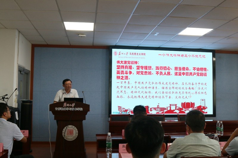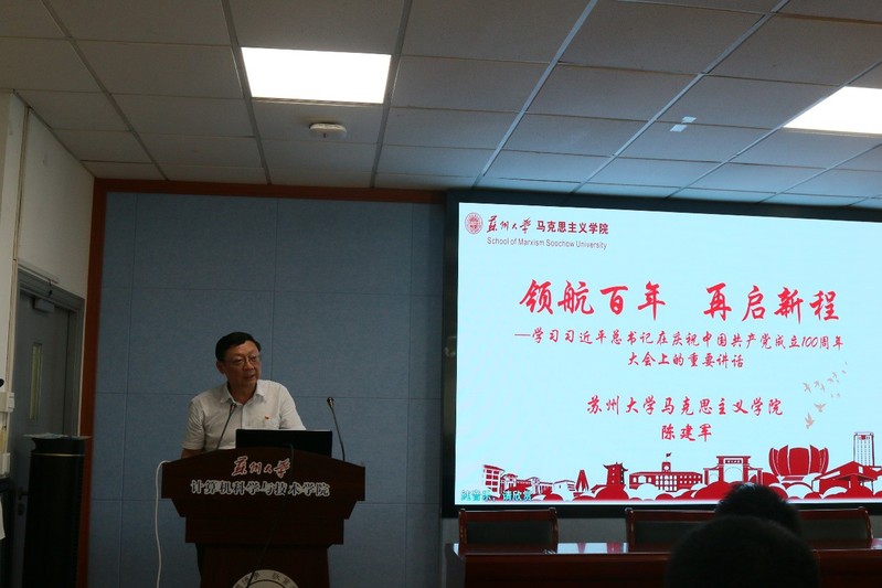 然后,马克思主义学院陈建军书记发表讲话。陈书记表示,今年是中国共产党成立一百周年,百年恰是风华正茂。前几日,习近平总书记在中国共产党成立一百周年大会上的讲话,对中华民族具有重要的指导意义。希望此次活动的举办,马院与计科院能够共建友好关系,共同学习“七一”讲话精神。