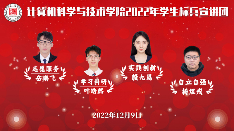前期经师生提名推荐及学院评审,评选出志愿服务标兵岳鹏飞、自强自立标兵杨煜戎、学习科研标兵叶皓然、实践创新标兵殷九思等四名同学,组成学院2022年学生标兵宣讲团。