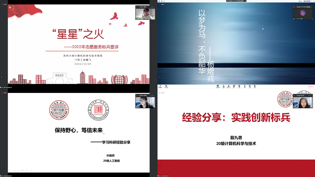 活动中,岳鹏飞围绕“星儿计划”分享了自己大学三年参加各类志愿服务活动的经历和感受,号召同学们积极参加志愿服务,主动帮助他人。他表示:“我在志愿服务中体会到了自己的价值。未来,这仍会是我生活中重要的组成部分,帮助他人已成为我生命中闪耀的阳光。”杨煜戎以“以梦为马,不负韶华”为题讲述了自己如何克服身体上的困难,坚定理想信念,坚持自立自强,实现自己在学习和生活上的一个个目标。他坚信,自强不息、砥砺奋斗是实现全面发展、成长成才的强大动力。叶皓然通过“沉淀、思考、热爱”三个关键词分享了他在学习科研上的方法与心得,高效的时间管理和高度的个人自律是他成为“多面手”的重要秘诀。他认为学好专业课程的关键在于寻找自己适合的学习方法和脚踏实地不断努力。殷九思结合自己参加学科竞赛的经历鼓励同学们做好学涯规划,积极参加实践活动。她说到,提早的职业生涯规划决定了努力的方向,实现最终的目标则需要一个个明确的中短期目标。