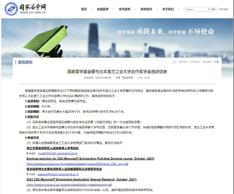 国家留学基金委与室兰工业大学合作项目官方介绍: