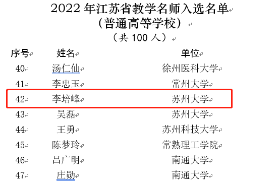 江苏省教学名师是省教育厅为全面贯彻习近平总书记关于教育的重要论述和中央人才工作会议精神,加快建设高素质专业化创新型教师队伍,制定的高层次教育人才支持计划。此次评选共选出2022年江苏省教学名师300人,其中普通高等学校100人。此次苏州大学共有2名教师入选,我院李培峰教授是其中之一。近年来我院高度重视教学团队建设和青年教师培养,发挥教学名师在高质量教师队伍建设中的引领作用,全面促进我院教师教育教学水平提升。