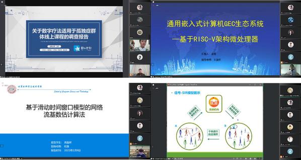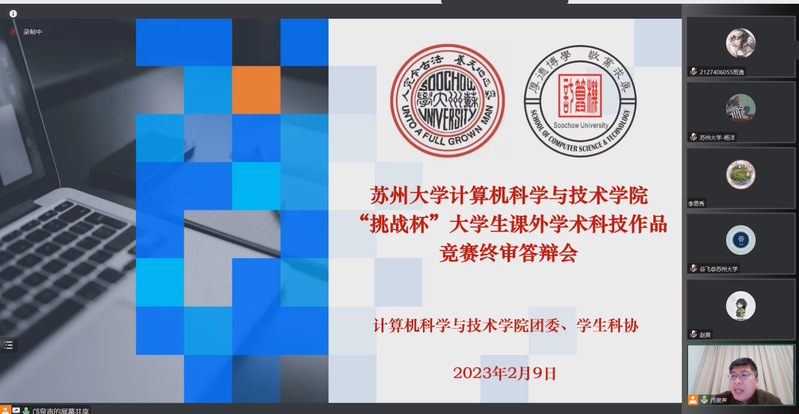 为进一步浓厚校园学术氛围,加强学风建设,推动大学生参与学术科技实践、发现和培养创新型人才,为“挑战杯”竞赛遴选培育优秀项目,我院团委、学生科协于2023年2月9日13:00在线举行院级“挑战杯”大学生课外学术科技作品竞赛终审答辩会。参加会议的包括各项目组成员、学生科协学生骨干和对科创活动感兴趣的师生。答辩由杨洋、陈伟、谷飞、汪笑宇、宋为刚和校外导师王康作为评委,还邀请到了院党委副书记李恩秀、辅导员赵爽作为嘉宾,会议由团委书记邝泉声主持。