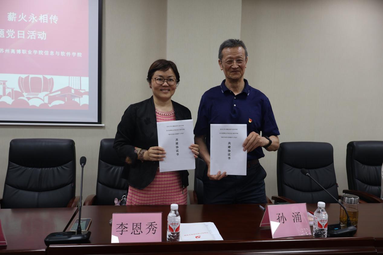 参观结束后,双方一同前往苏州高博职业学院进行参观,并在会议室进行交流学习。在双方领导对各自单位和党组织基本情况进行了介绍之后,苏州高博职业学院信息与软件学院院长孙涌和学院党委副书记、副院长李恩秀共同完成了“辅导员成长发展提升工作室”挂牌仪式,并签订了共建协议。工作室的建立希望两院辅导员能利用平台促进工作实践和科学研究的开展,构建前辈领航和朋辈互助的氛围,达到同行交流和相互促进目标,为两院的辅导员队伍建设服务。