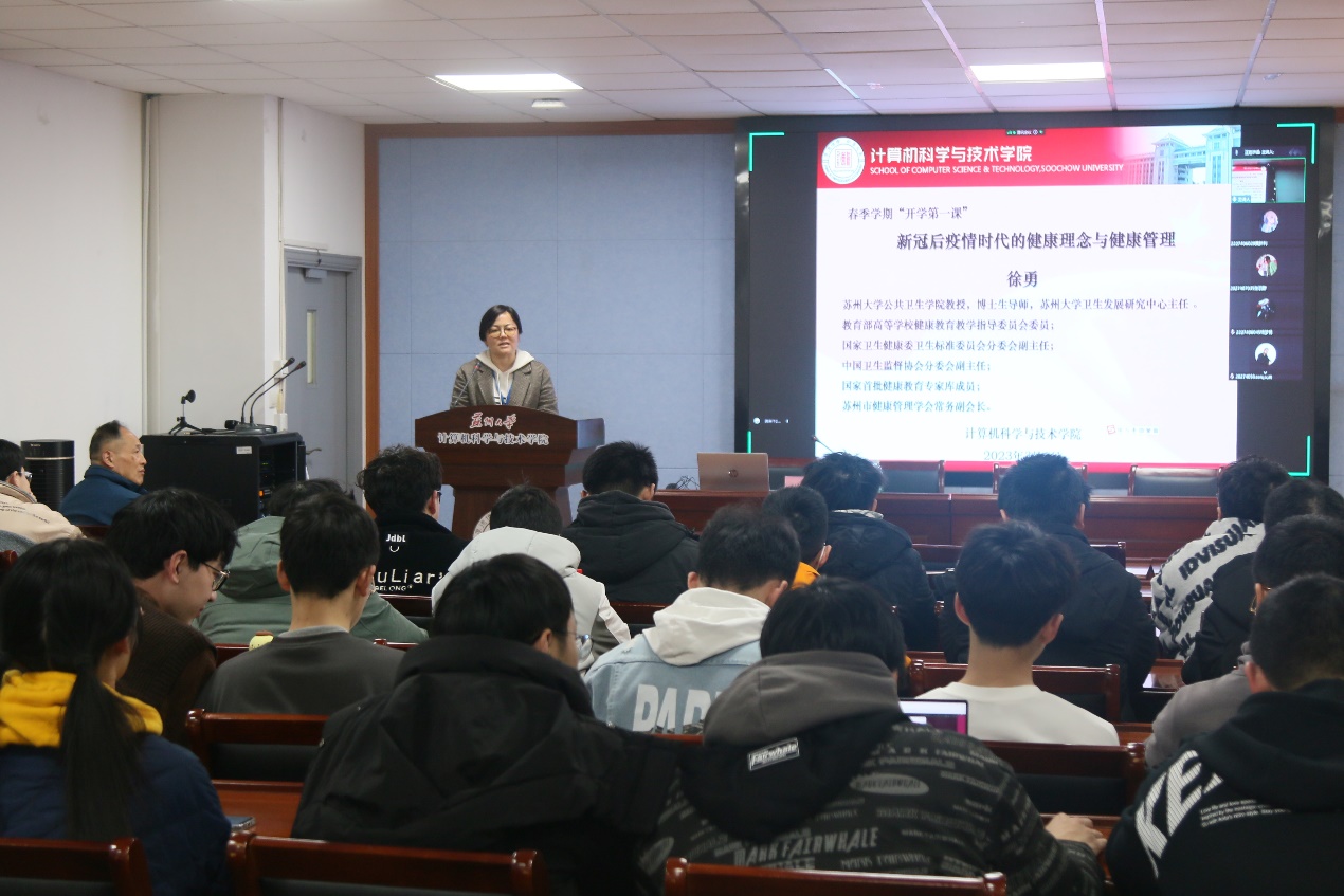 为深入学习贯彻习近平新时代中国特色社会主义思想和党的二十大精神,着力培养担当民族复兴大任的时代新人,全面推进“铸魂逐梦”工程,引导学生坚定理想信念,尽快适应疫情防控政策变化后的新学期,学院于3月1日下午在理工楼504会议室线上线下结合,为全院同学举行2023年春季学期“开学第一课”系列讲座之新冠后疫情时代的健康理念与健康管理。活动邀请到了苏州大学公共卫生学院教授、博士生导师徐勇主讲,各班生活委员、学生骨干代表70人线下参会,全体本科生线上聆听。活动由院党委副书记、副院长李恩秀主持。