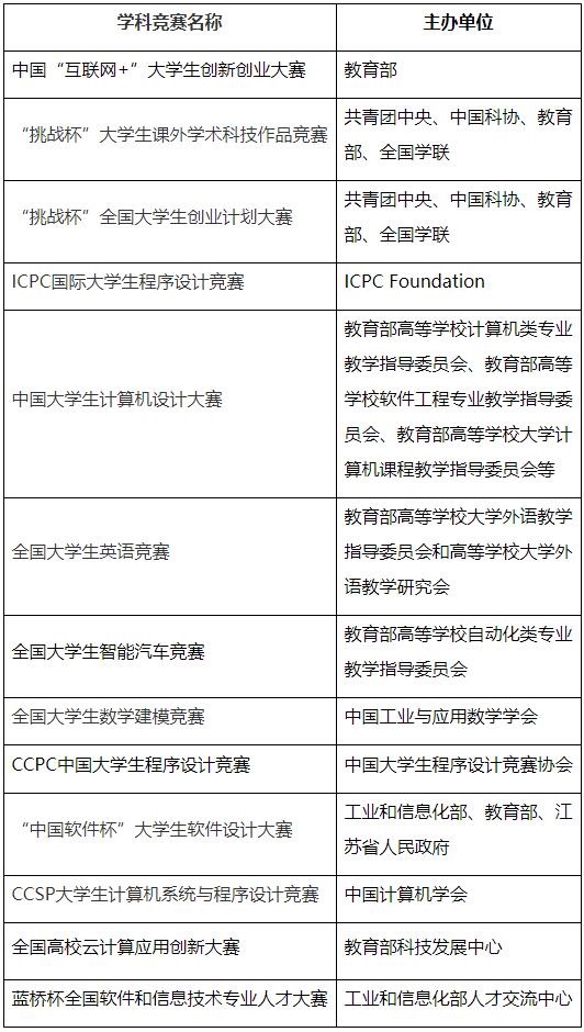 挑战杯课外学术科技作品竞赛、中国大学生计算机设计大赛、中国软件杯大赛等
